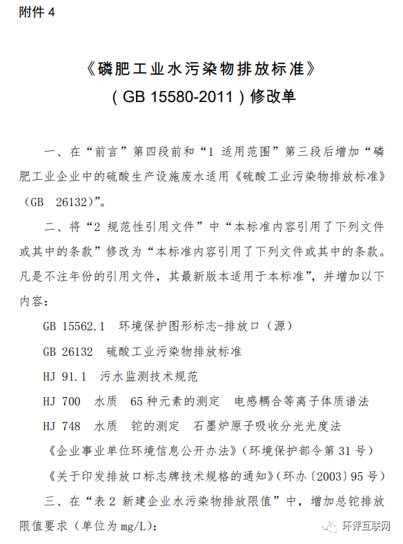4.《磷肥工業水污染物排放標準》(GB 15580-2011)修改單