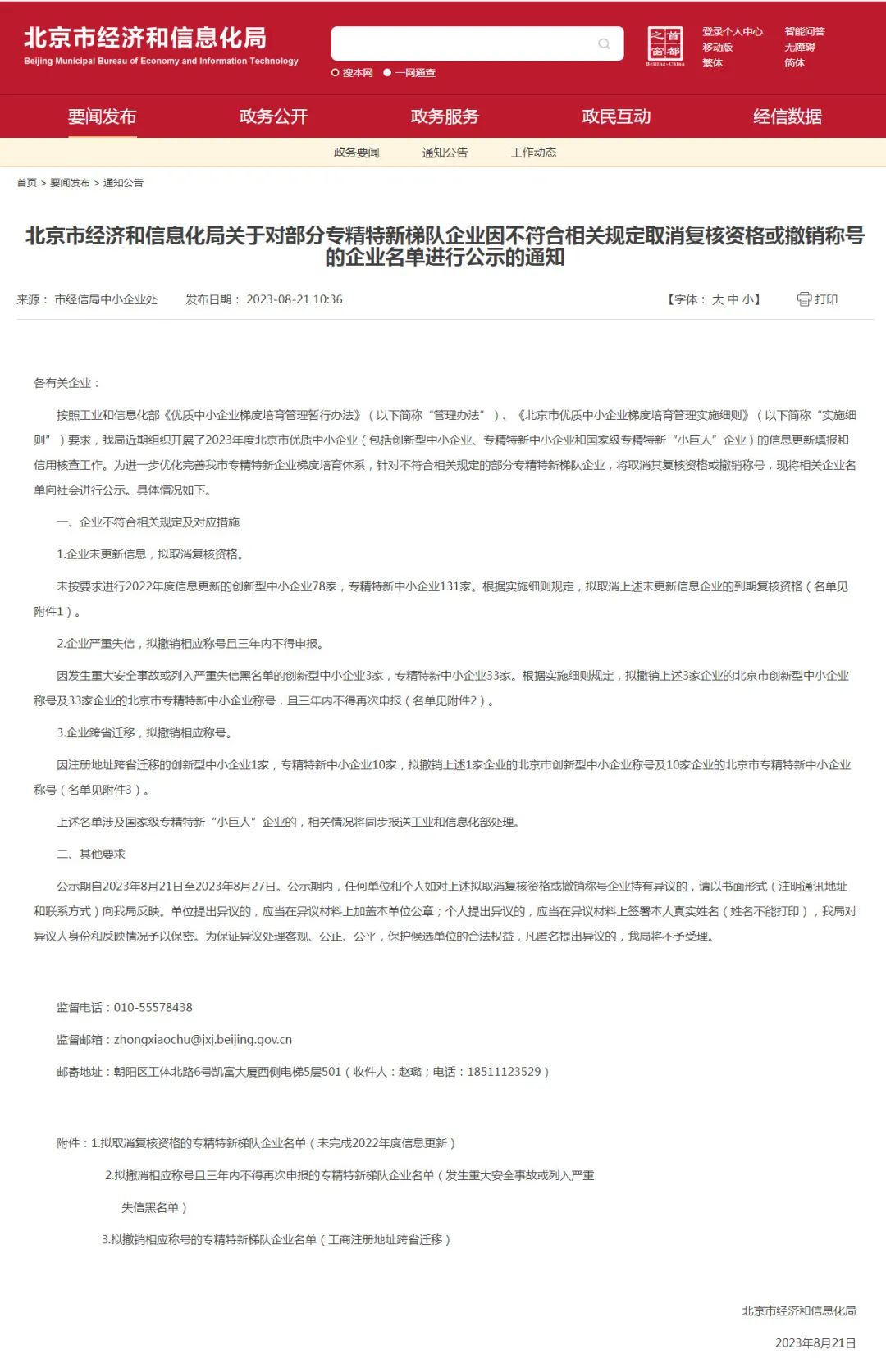 8月21日,北京市經信局官網公布消息顯示,為進一步優(yōu)化完善北京市專精特新企業(yè)梯度培育體系,針對不符合相關規(guī)定的部分專精特新梯隊企業(yè),將取消其復核資格或撤銷稱號,并將相關企業(yè)名單向社會進行公示。公示名單共涉及北京174家專精特新中小企業(yè)和82家創(chuàng)新型中小企業(yè)!
