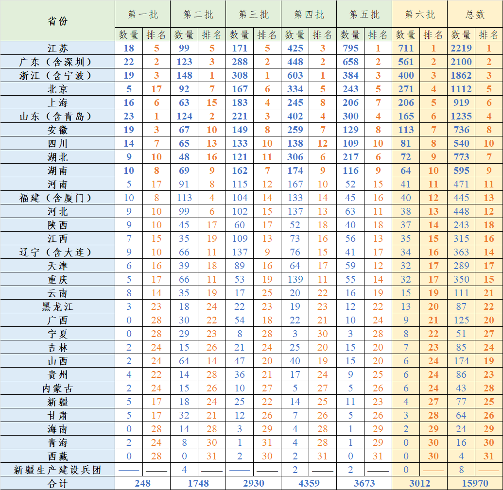 圖1. 前六批“小巨人”數(shù)量及排名