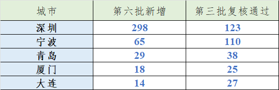 圖2.五個(gè)計(jì)劃單列市第六批新增與第三批通過(guò)復(fù)審“小巨人”數(shù)量