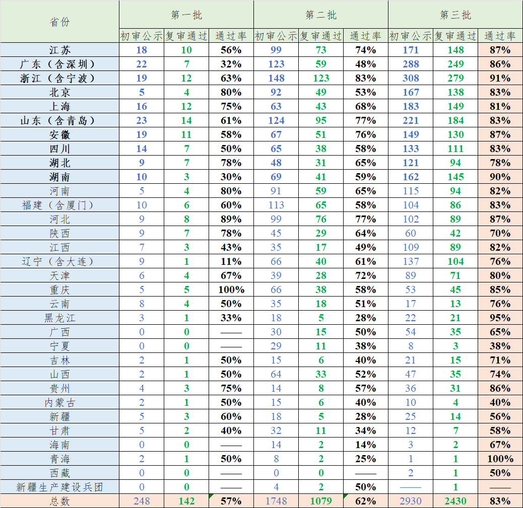 圖3.各省市前三批“小巨人”復(fù)審?fù)ㄟ^(guò)率一覽