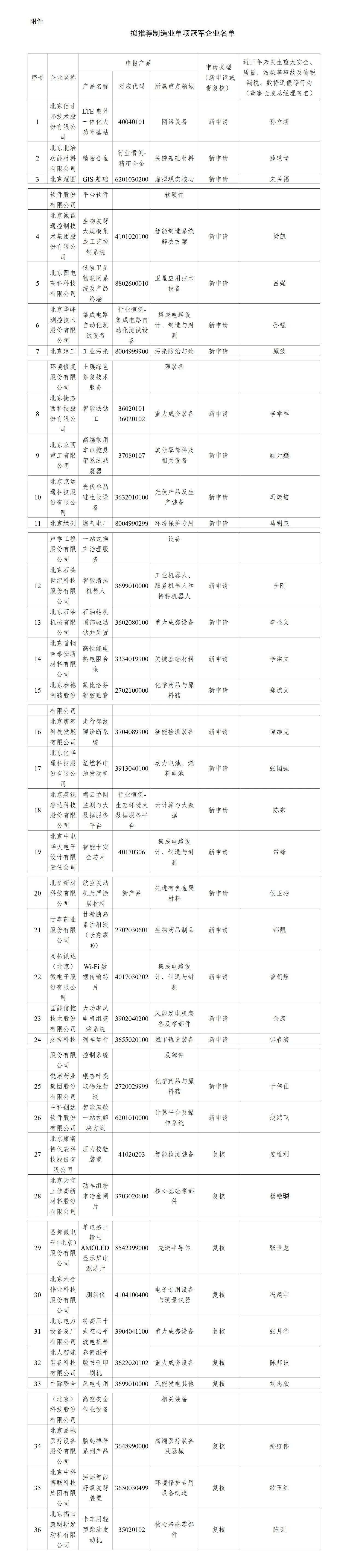 根據(jù)《工業(yè)和信息化部辦公廳關(guān)于開展2024年制造業(yè)單項冠軍企業(yè)遴選認定和復(fù)核評價工作的通知》(工信廳政法函〔2024〕328號),北京市經(jīng)濟和信息化局組織開展了2024年國家制造業(yè)單項冠軍企業(yè)遴選認定和復(fù)核評價推薦工作,已按規(guī)定程序完成相關(guān)審核、公示及上報。現(xiàn)根據(jù)工信部相關(guān)工作部署,按照公示模板再次公示(詳見附件)。