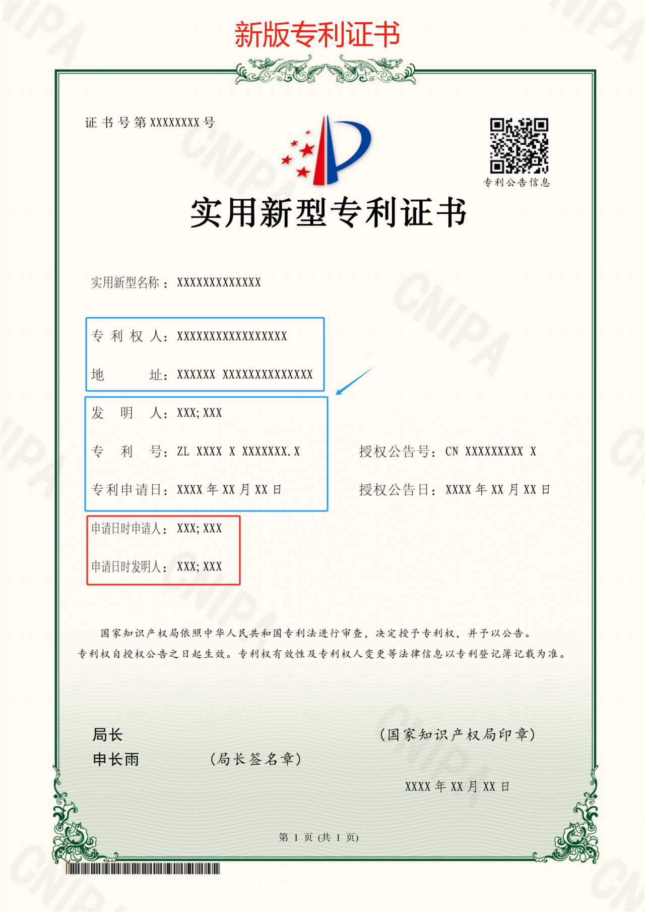 此外,實用新型專利證書和外觀設計專利證書也有相同變化。