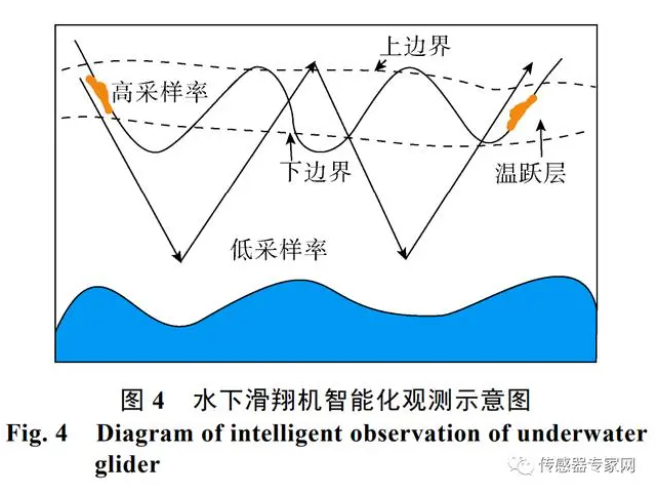 海洋傳感器的智能化特征還體現在故障自診斷、自修復以及在觀測過程中對被觀測對象的特征進行智能化判斷方面。以水下滑翔機為例, 如圖 4 所示, 未來智能化的觀測平臺以及傳感器,可以按照特殊的科學研究觀測需求, 進行邏輯判斷和自適應采樣率動態控制, 在溫躍層等重點關注區域進行加密測量, 其他區域則降低觀測密度,這樣既可以降低功耗, 又可以增加在位時間。智能化傳感器與平臺電源管理、運動速度和姿態協調相適應, 可以獲取更多有效的觀測數據質量,提高觀測效能。