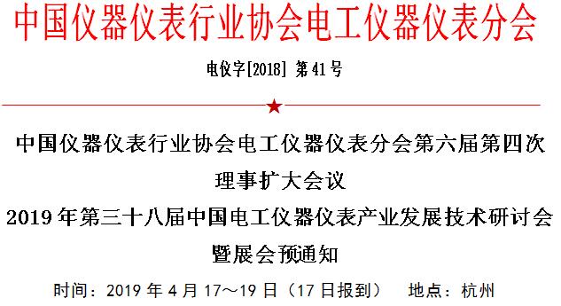 中國儀器儀表行業協會電工儀器儀表分會定于 2019 4月在杭州召開“2019 第三十八屆中國電工儀器儀表產業發展技術研討會暨展會,同期召開中國儀器儀表行業協會電工儀器儀表分會第六屆第四次理事擴大會議。