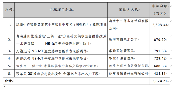 新天科技于近期中標(biāo)物聯(lián)網(wǎng)智能水表及智慧農(nóng)業(yè)節(jié)水項(xiàng)目,合計(jì)中標(biāo)金額5,824.21萬元,具體項(xiàng)目中標(biāo)情況如下: