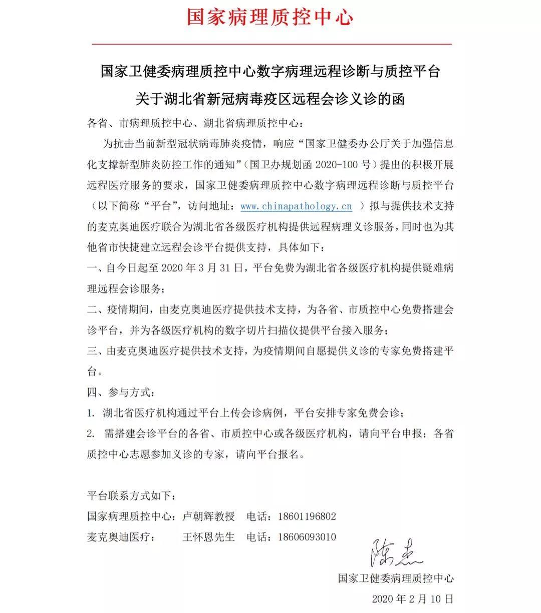 為抗擊當前新冠病毒感染的肺炎疫情,響應“國家衛(wèi)健委辦公廳關于加強信息化支撐新型肺炎防控工作的通知”(國衛(wèi)辦規(guī)劃函2020-100號)提出的積極開展遠程醫(yī)療服務的要求,支援湖北省抗擊新型冠狀病毒肺炎的疫情,國家衛(wèi)健委病理質(zhì)控中心數(shù)字病理遠程診斷與質(zhì)控平臺(以下簡稱“平臺”,訪問地址:www.chinapathology.cn )擬與提供技術支持的麥克奧迪醫(yī)療聯(lián)合為湖北省各級醫(yī)療機構提供遠程病理義診服務,同時也為其他省市能快捷建立遠程會診平臺提供支持,具體如下: