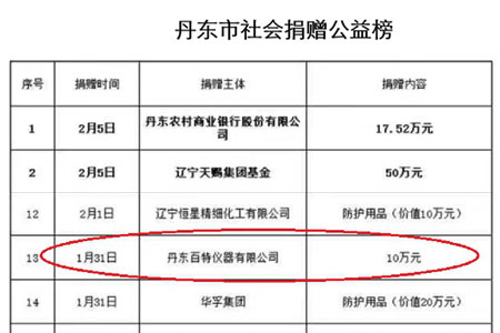 公司總經理董青云、副總經理劉忠蘭鼎力支持公司黨支部發起的“抗疫情,獻力量”捐款倡議。他們在代表公司向丹東慈善總會捐款10萬元后,指示將庫存的一百多只紅外線體溫槍捐贈給企業和社會各界用于防控疫情,又積極參加黨支部發起的捐款活動,表現出了企業家胸懷國家、無私奉獻的情懷。