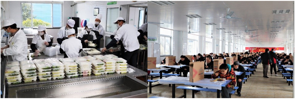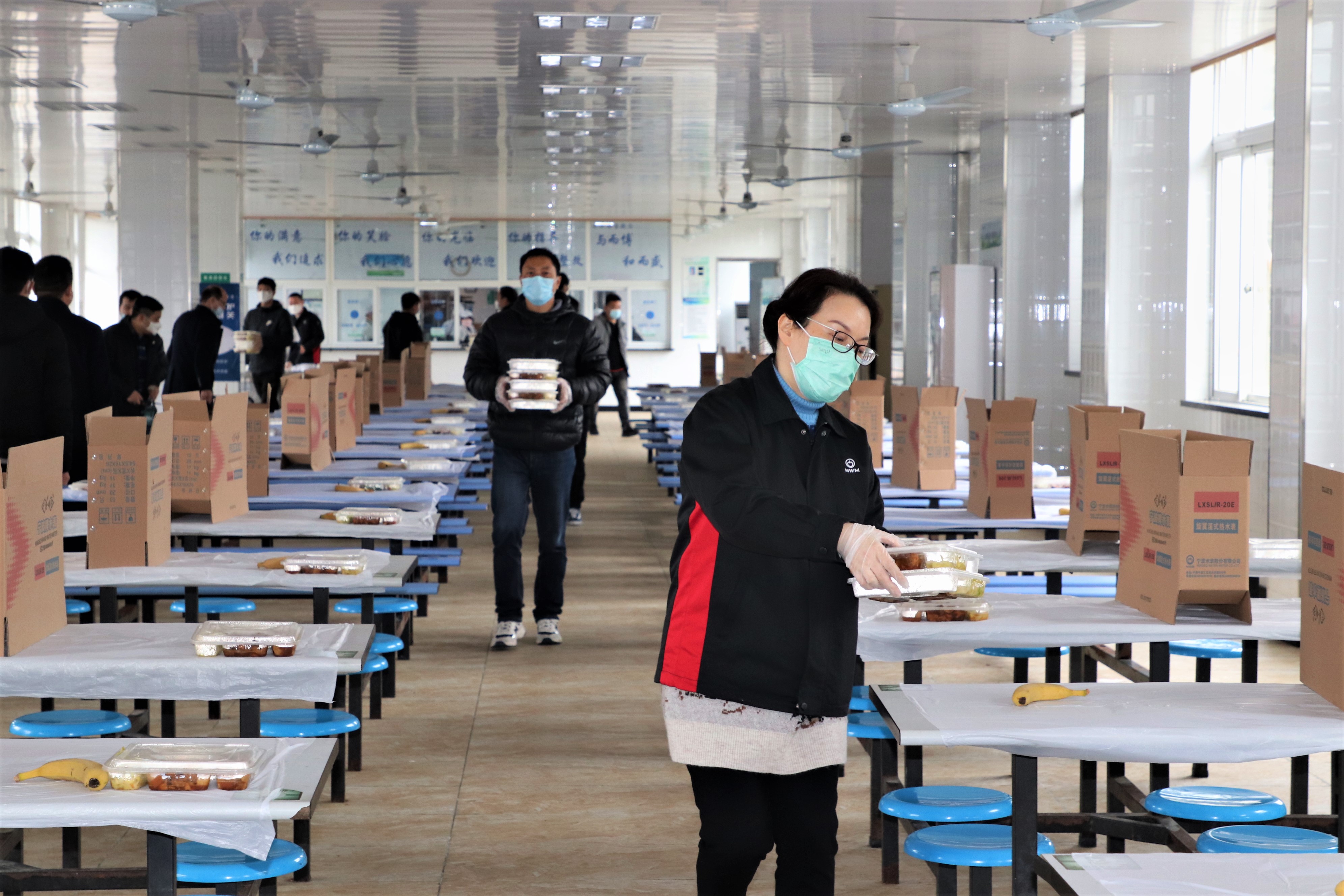 在清晨的寒風中,他們站立于門崗口,手持測溫槍,為前來上班的員工一一測量體溫……不到中午11點,又總能看到那么幾個身影出現在食堂。他們為每批次用餐員工提前鋪好一次性餐布,擺放好餐具、餐盤,直至將所有批次分餐結束……