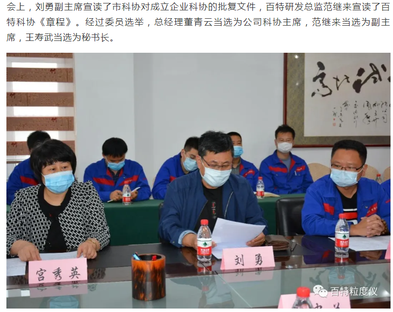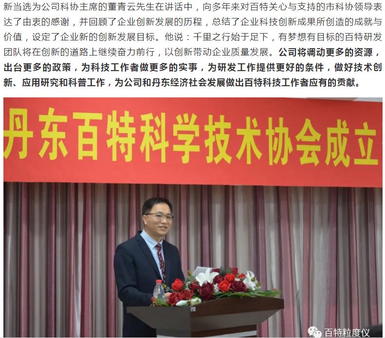 丹東百特儀器有限公司是中國儀器儀表行業(yè)協(xié)會(huì)會(huì)員單位,主要產(chǎn)品:智能激光粒度儀,顯微圖像粒度粒形分析儀,粉體綜合特性測試儀,沉降粒度儀,光阻法顆粒計(jì)數(shù)器,PM2.5監(jiān)測儀,光阻法粒徑譜儀。為提升公司的創(chuàng)新能力,6月2日,丹東百特儀器有限公司隆重召開丹東百特科學(xué)技術(shù)協(xié)會(huì)成立暨第一次會(huì)員會(huì)議,丹東市科協(xié)主席宮秀英、副主席劉勇等領(lǐng)導(dǎo)到會(huì)祝賀,百特公司董事長、總經(jīng)理董青云,副總經(jīng)理劉忠蘭等會(huì)員參加會(huì)議。