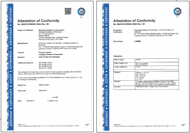 近日,中國科學院沈陽自動化研究所獲得了國際認證機構TüV (南德意志大中華集團)頒發(fā)的總線型智能壓力變送器SIL2/3功能安全認證證書,這是我國首張總線型壓力變送器安全認證證書。此前,沈陽自動化所獲得了該機構頒發(fā)的智能溫度變送器SIL2/3功能安全認證證書。