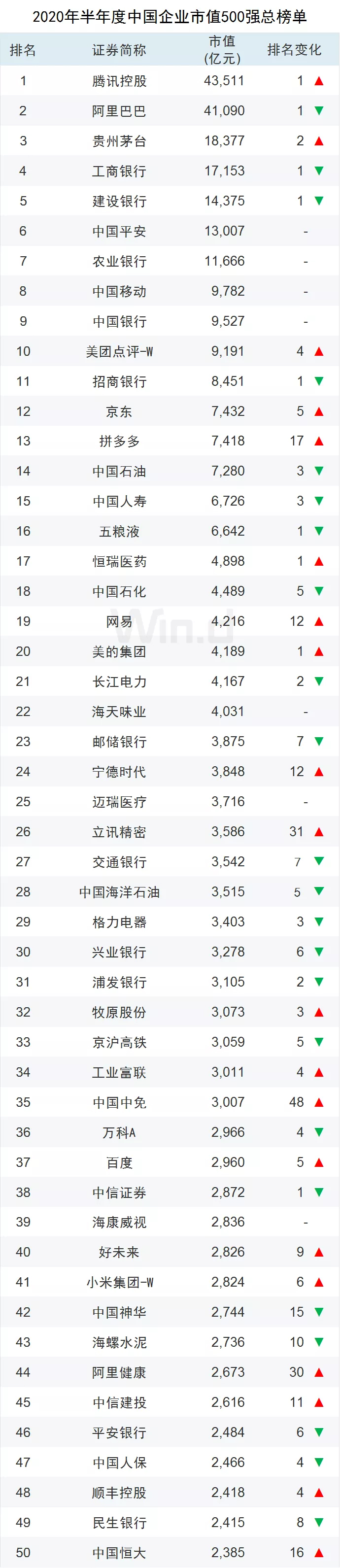 近日,Wind最新發布2020年半年度“中國上市企業市值500強”榜單。