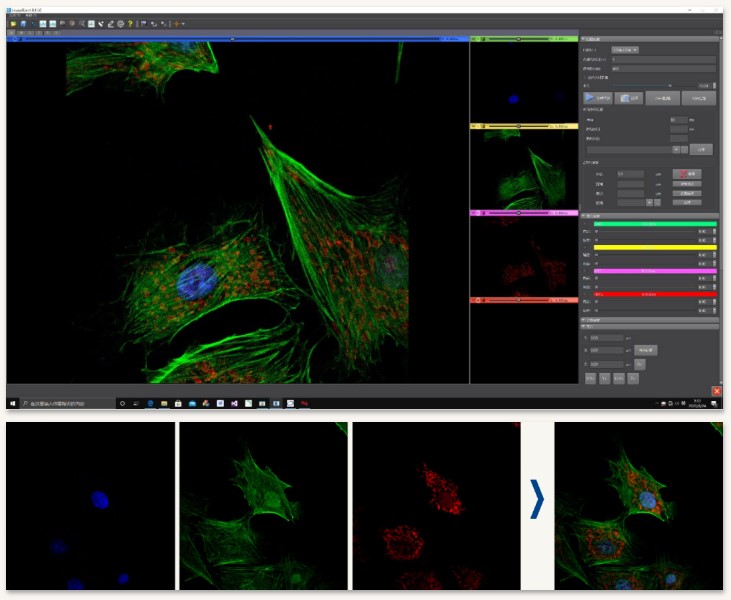 在信號探測方面,NCF950配備了四個PMT(光電倍增管)探測器,可以實現高靈敏度的熒光信號探測。四路探測信號根據激發光的波長 自動進行圖像熒光染色和合成,實現實時多通道探測和顯示。