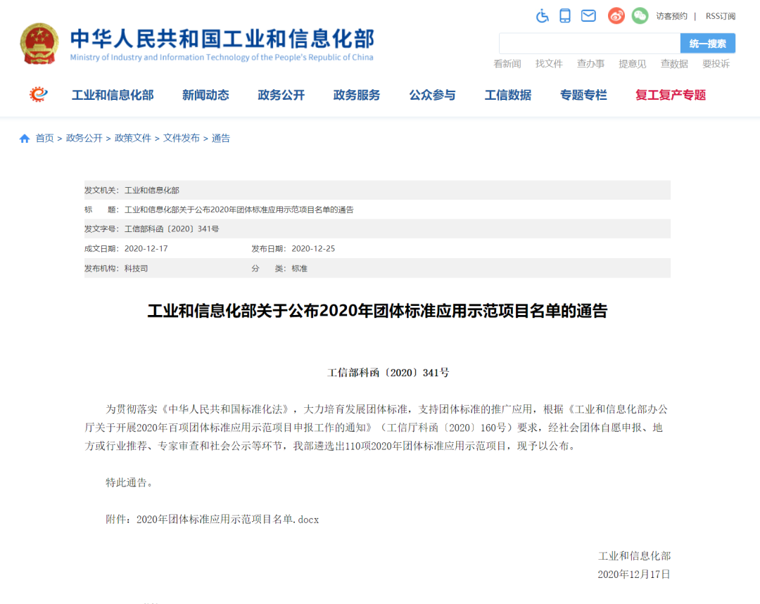 2020年團體標準應用示范項目是為貫徹落實《中華人民共和國標準化法》,大力培育發(fā)展團體標準,支持團體標準的推廣應用,根據(jù)《工業(yè)和信息化部辦公廳關(guān)于開展2020年百項團體標準應用示范項目申報工作的通知》(工信廳科函〔2020〕160號)要求,經(jīng)社會團體自愿申報、地方或行業(yè)推薦、專家審查和社會公示等環(huán)節(jié),由工業(yè)和信息化部遴選后予以公布。
