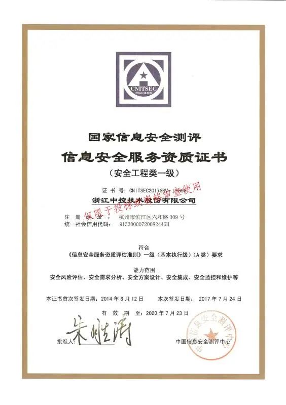 近期,中控技術(shù)成功取得信息安全的服務(wù)認(rèn)證——安全集成、安全運(yùn)維、風(fēng)險(xiǎn)評(píng)估方向三級(jí)(中國(guó)網(wǎng)絡(luò)安全審查技術(shù)與認(rèn)證中心)及信息安全服務(wù)資質(zhì)——安全工程類一級(jí)(中國(guó)信息安全測(cè)評(píng)中心)兩項(xiàng)資質(zhì)。