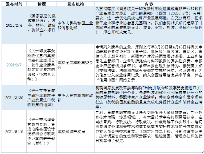 2021年1-8月國家針對集成電路產業出臺的政策主要集中在稅收、知識產權保護及推動產業發展等方面,其中稅收優惠政策是該階段的主題,2021年2月國家發展和改革委員會發布了《關于印發享受稅收優惠的集成電路企業或項目、軟件企業清單制定有關要求的通知(征求意見稿)》,隨后在3月份財政部等5部門聯合發布《關于支持集成電路產業和軟件產業發展進口稅收政策的通知》,這些政策規定了集成電路行業享受稅收優惠條件和需履行的義務。除此之外,國家知識產權局發布了《關于技術調查官參與專利、集成電路布圖設計侵權糾紛行政裁決辦案的若干規定(暫行)》以期能夠解決專利、集成電路布圖設計侵權糾紛問題。從發布的政策看,目前有關部門對于支持集成電路產業的發展多管齊下,從稅收優惠、知識產權保護等方面優化產業發展環境,推動產業發展。