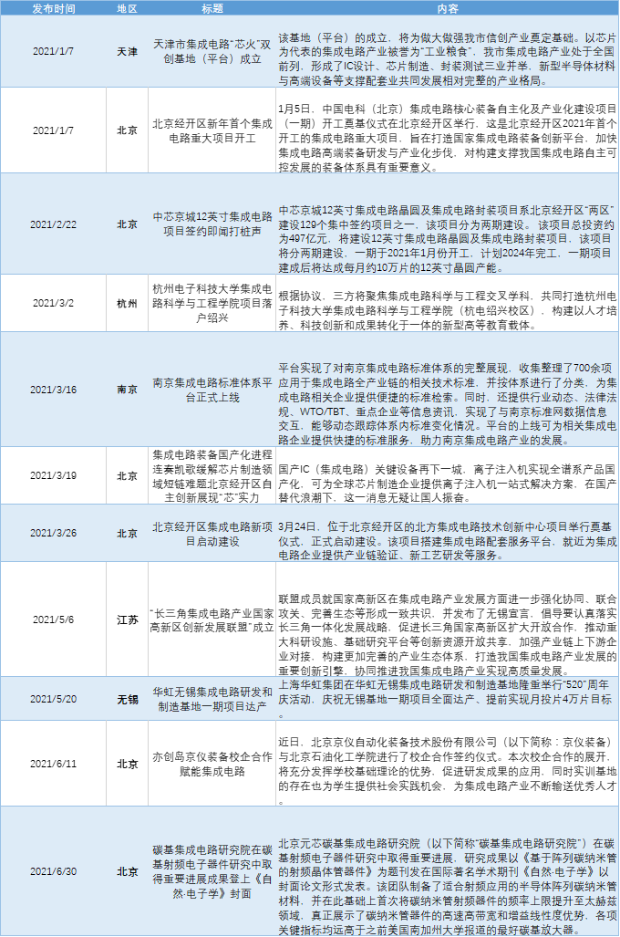 2021年集成電路產業集群重點事件