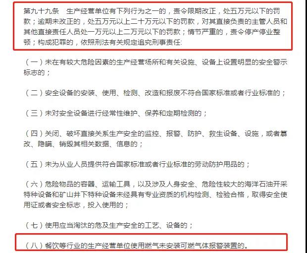 即將于9月1日正式施行的《中華人民共和國安全生產(chǎn)法》第三十六條明確規(guī)定,“餐飲等行業(yè)的生產(chǎn)經(jīng)營單位使用燃?xì)獾模瑧?yīng)當(dāng)安裝可燃?xì)怏w報警裝置,并保障其正常使用”。