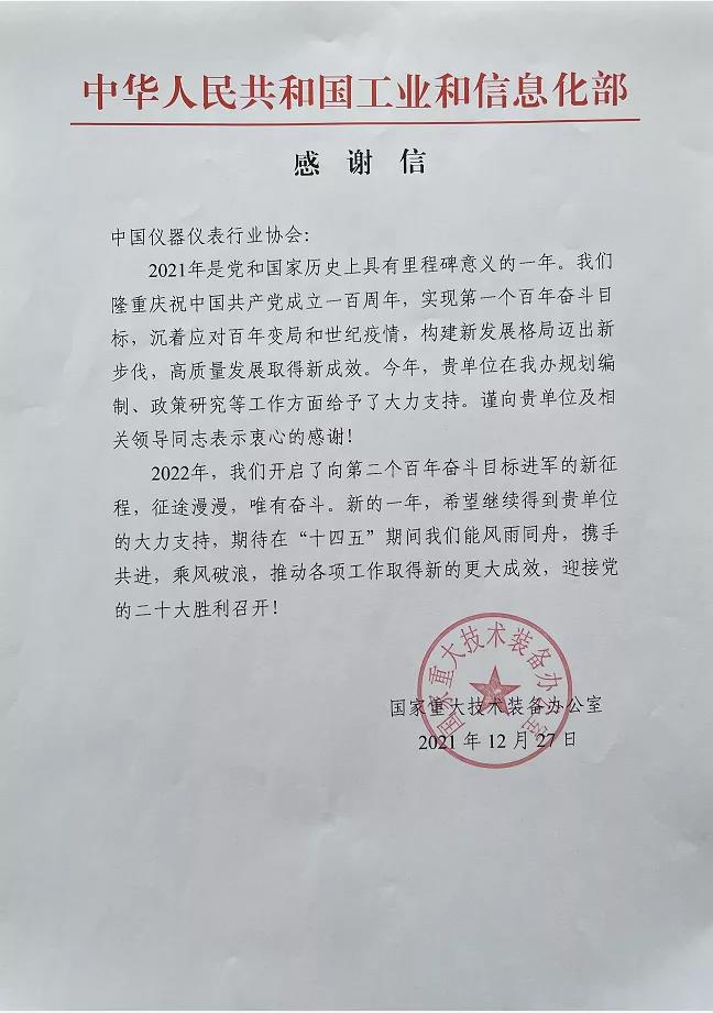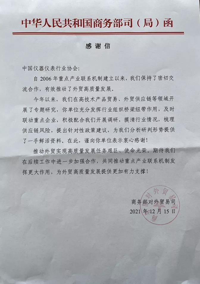 近日,工業(yè)和信息化部重大技術(shù)裝備辦公室、商務(wù)部對(duì)外貿(mào)易司向中國(guó)儀器儀表行業(yè)協(xié)會(huì)發(fā)來(lái)感謝信,對(duì)協(xié)會(huì)2021年在發(fā)揮行業(yè)組織橋梁紐帶作用、凝聚行業(yè)發(fā)展共識(shí)、反映行業(yè)運(yùn)行訴求、促進(jìn)行業(yè)健康發(fā)展、為相關(guān)部門提供信息支撐和決策參考等方面發(fā)揮的作用和開展的工作給予高度評(píng)價(jià),對(duì)協(xié)會(huì)積極配合部委工作給予的大力支持表示誠(chéng)摯感謝。