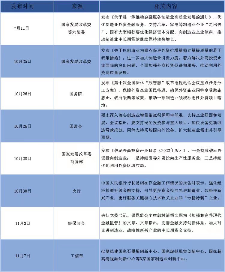 中國人民銀行行長易綱10月30日在作金融工作情況的報告時表示,強化經濟轉型升級金融支持,引導更多資金投向先進制造業、戰略性新興產業;央行黨委書記、銀保監會主席郭樹清11月3日在銀保監會官網撰文指出,完善金融支持創新體系,加大對先進制造業、戰略性新興產業的中長期資金支持。