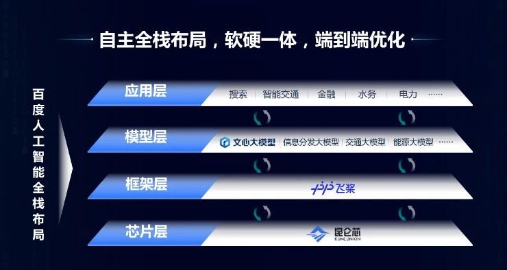 這方面百度有比較明顯的優(yōu)勢(shì),我們?cè)谒膶赢?dāng)中每一層都有比較領(lǐng)先的產(chǎn)品,比如說芯片層有昆侖芯。這個(gè)也做了有十年之久,最早是因?yàn)樗阉鲬?yīng)用需要,我們買別人的芯片,畢竟太貴了,所以自己開發(fā)了。框架層是飛槳,飛槳今天在中國(guó)的市場(chǎng)份額第一。在模型層是文心大模型,其實(shí)除了文心一言,它是對(duì)標(biāo)ChatGPT的之外,我們還有很多行業(yè)大模型,如交通大模型、能源大模型等。應(yīng)用層的話,像百度搜索等都是我們比較領(lǐng)先的應(yīng)用。