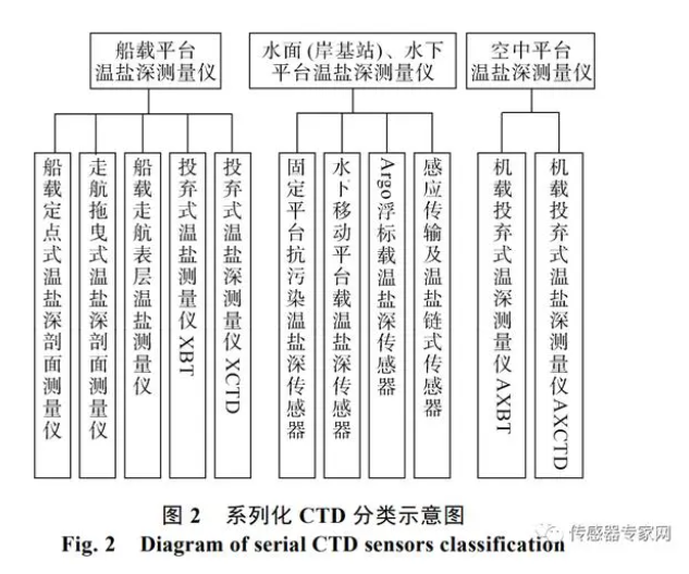 目前, 世界上主要海洋科技強國都擁有自己的 CTD 知名企業, 包括美國 Seabird 和 RDI, 加拿大 AML 和 RBR、德國 Sea & Sun Technology、意大利 IDRONAUT、日本 ALEC 以及英國 VALPORT 等。其中,Seabird 公司的 CTD 傳感器產品在精度、可靠性等方面尤為突出, 占據了國內外大多數市場份額。一般按照船載、水面和水下、機載 3 類搭載平臺對 CTD 傳感器進行系列化分類, 具體如圖 2所示。