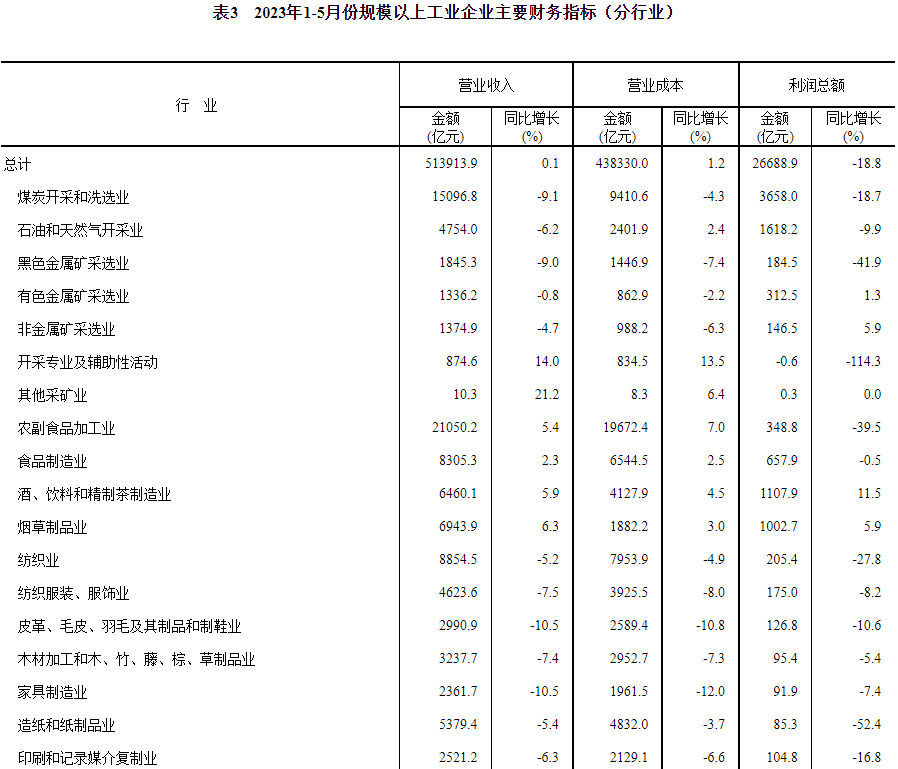 1—5月份,全國(guó)規(guī)模以上工業(yè)企業(yè)實(shí)現(xiàn)利潤(rùn)總額26688.9億元,同比下降18.8%,降幅比1—4月份收窄1.8個(gè)百分點(diǎn)。