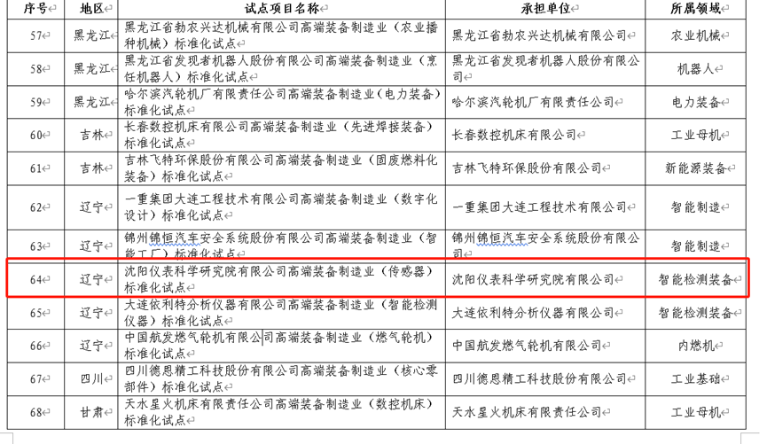 近日,國(guó)家標(biāo)準(zhǔn)化管理委員會(huì)發(fā)布了擬下達(dá)的第三批國(guó)家高端裝備制造業(yè)標(biāo)準(zhǔn)化試點(diǎn)項(xiàng)目的公示名單,沈陽(yáng)儀表科學(xué)研究院有限公司高端裝備制造業(yè)(傳感器)標(biāo)準(zhǔn)化試點(diǎn)項(xiàng)目榜上有名。