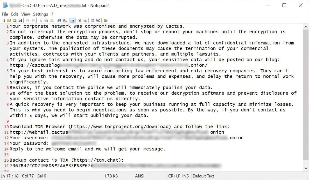 Cactus 勒索軟件行動(dòng)于 2023 年 3 月啟動(dòng),與所有勒索軟件行動(dòng)一樣,威脅攻擊者會(huì)通過(guò)購(gòu)買(mǎi)憑證、與惡意軟件分銷(xiāo)商合作、網(wǎng)絡(luò)釣魚(yú)攻擊或利用漏洞入侵企業(yè)網(wǎng)絡(luò)。一旦進(jìn)入網(wǎng)絡(luò),就會(huì)悄悄擴(kuò)散到其他系統(tǒng),同時(shí)竊取服務(wù)器上的企業(yè)數(shù)據(jù)。在竊取數(shù)據(jù)并獲得網(wǎng)絡(luò)管理權(quán)限后,威脅攻擊者會(huì)加密文件并留下贖金說(shuō)明。