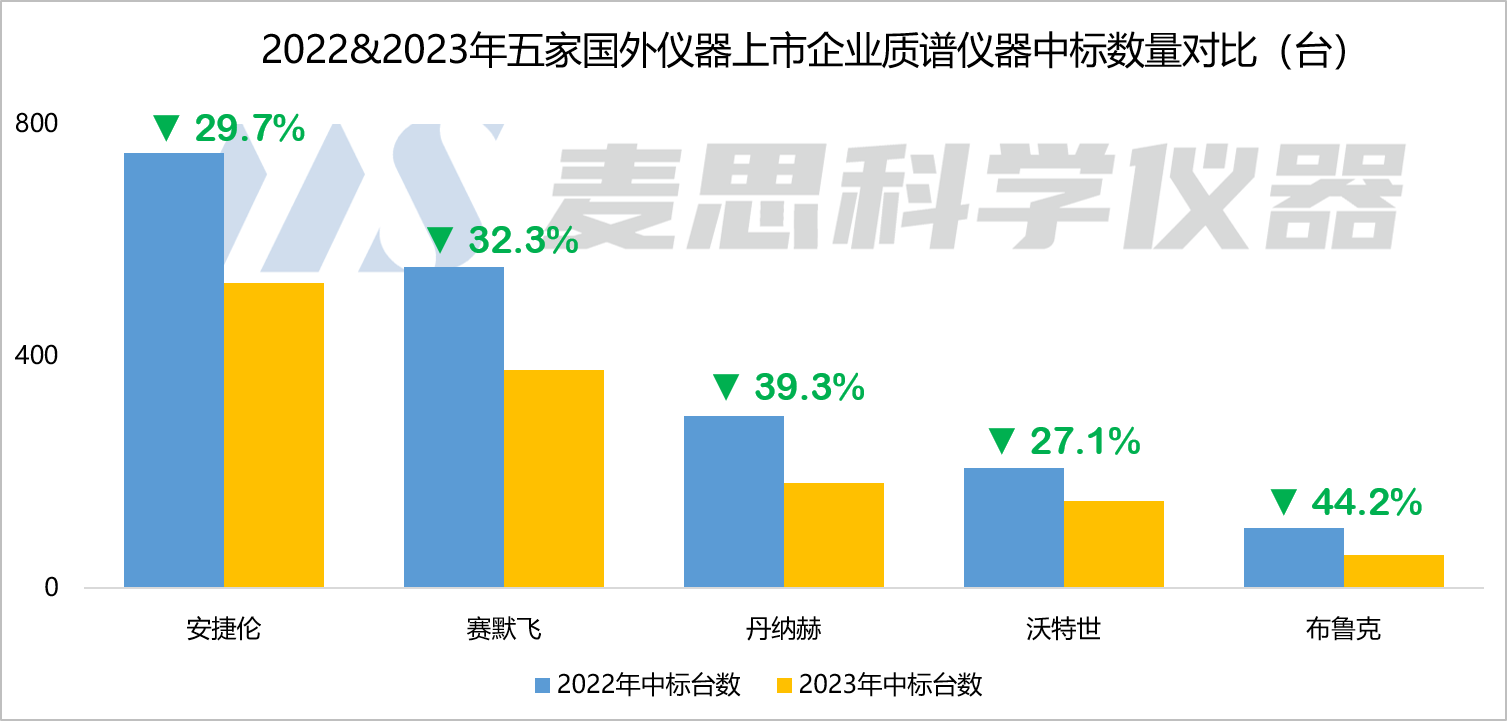 從中標數(shù)據(jù)來看,雖然2023年上述五家國外企業(yè)進入了中國質(zhì)譜儀器中標市場的TOP 10廠商行列,但他們中標數(shù)量和中標金額同比都有比較明顯的下降。