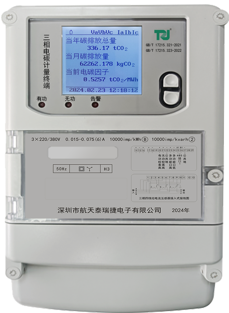 近日,航天泰瑞捷成功研制首款電碳計量終端(“電碳表”)。該款電碳表是在航天泰瑞捷自研的碳計量模型算法基礎上研發,它不僅具有傳統的電能計量功能,還能配合系統端動態計算更新電碳因子的準確數值,實時顯示累計碳排放量數據,為用戶提供準確的碳排放量。該款電碳表根據用戶的用電情況,實時調整不同的電碳因子,實時計算并給出企業用電帶來的碳排放量,體現電力生產源頭的時間和地域差異。用戶可實時掌握自身碳排放情況,為制定更加綠色低碳的生產模式提供依據。
