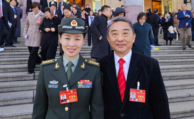 圖為今年全國(guó)兩會(huì),全國(guó)政協(xié)委員、航天員王亞平與全國(guó)政協(xié)委員、永新光學(xué)董事長(zhǎng)曹其東在人民大會(huì)堂前合影