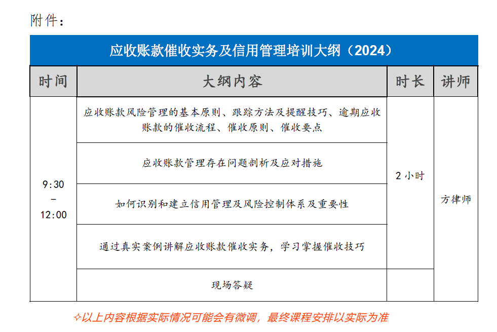 附件:應收賬款催收實務及信用管理培訓大綱(2024
