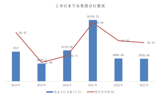 將時間線拉長。自20191月上市以來,寧水集團已連續(xù)6年進行現(xiàn)金分紅(2018年至2023年),十分重視業(yè)績增長對于股東的回報情況。數(shù)據(jù)顯示,自2021年公司分紅總額以及股利支付率雙雙抵達峰值后,寧水集團近兩年的股息支付率均維持在45%以上。公司6次分紅金額累計高達4.87億元。