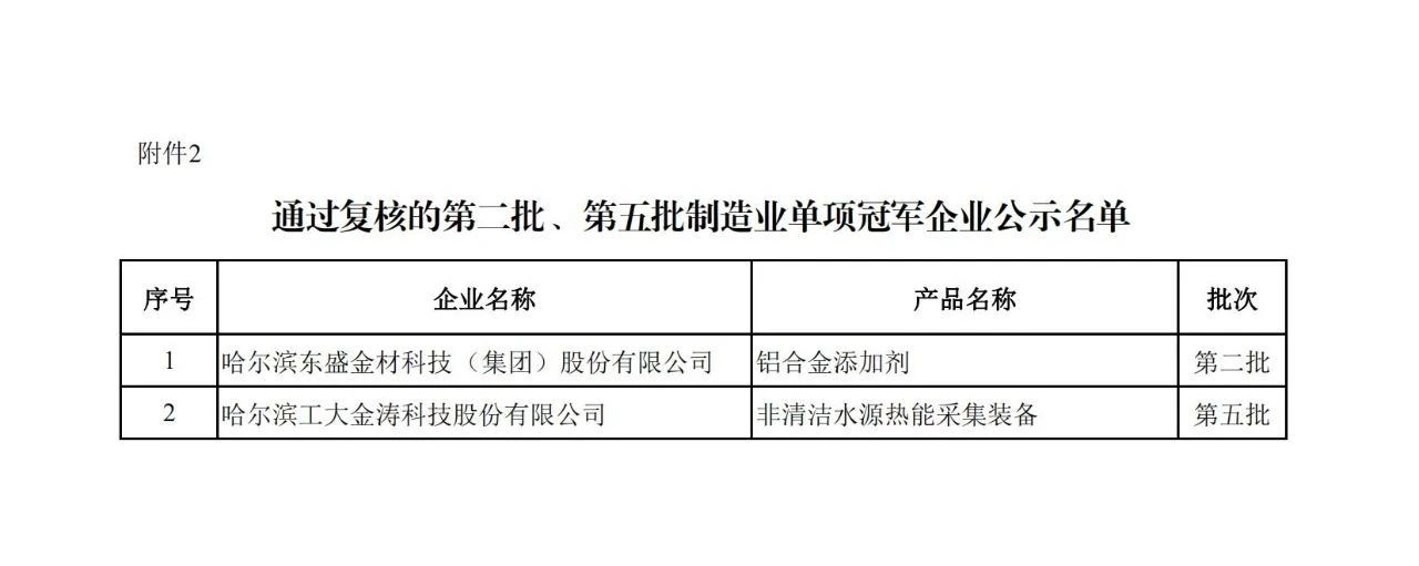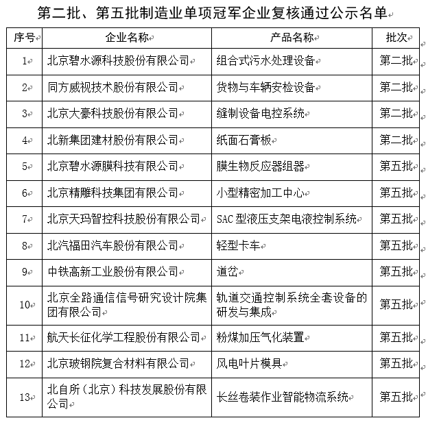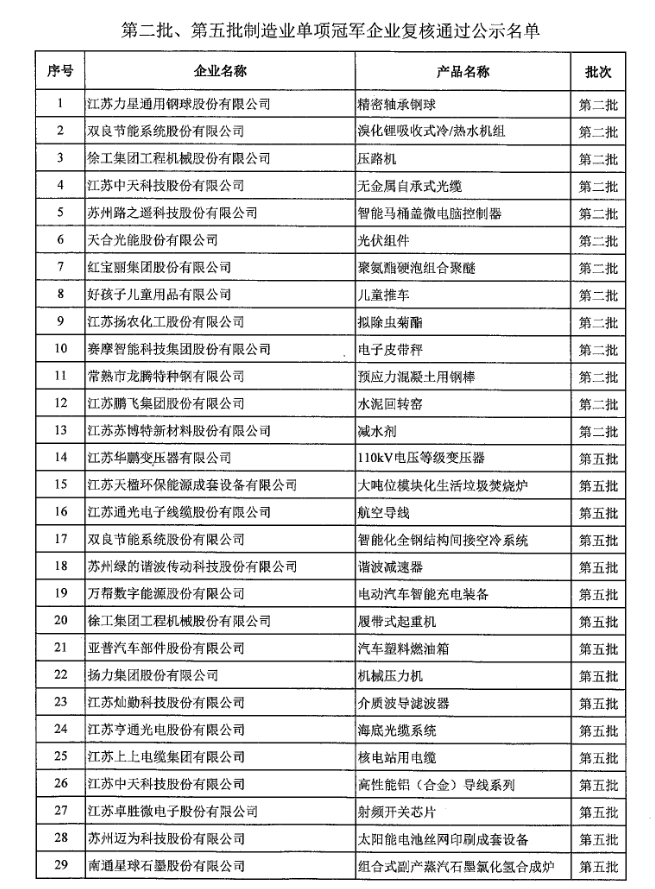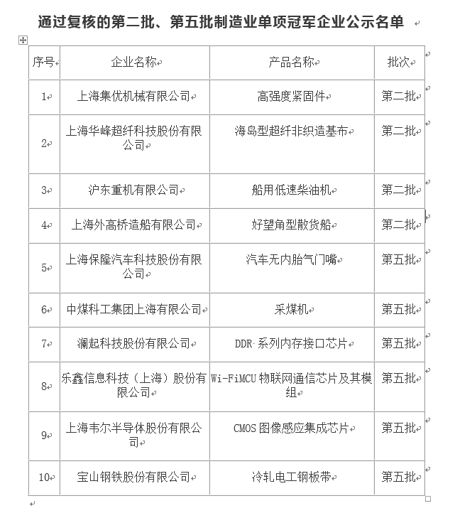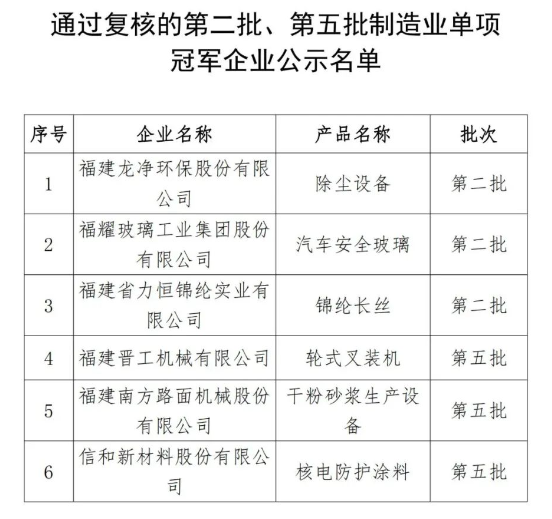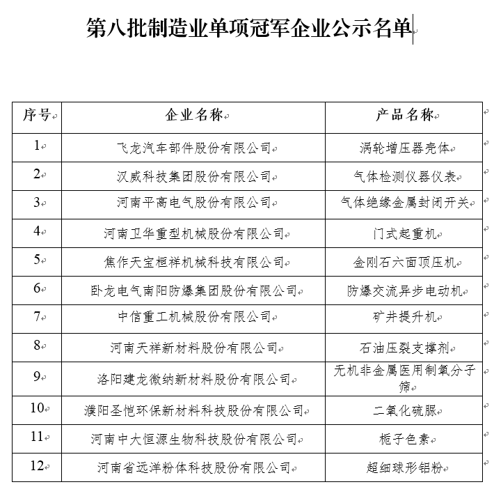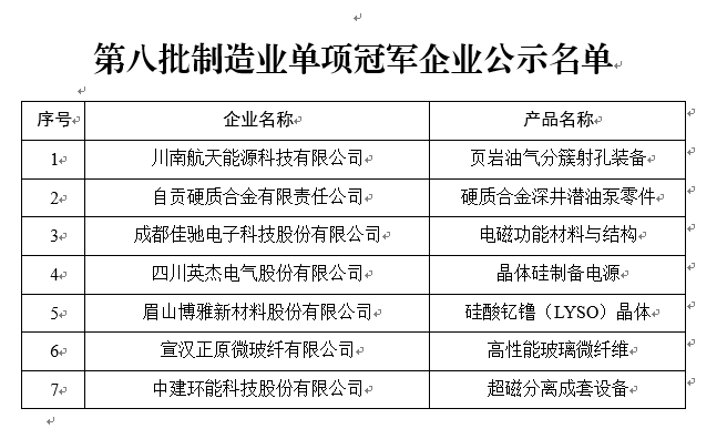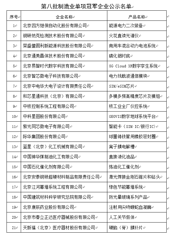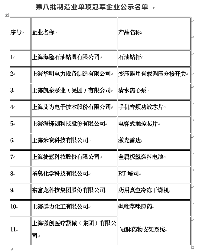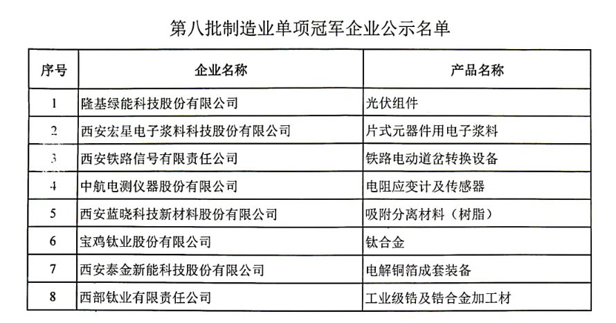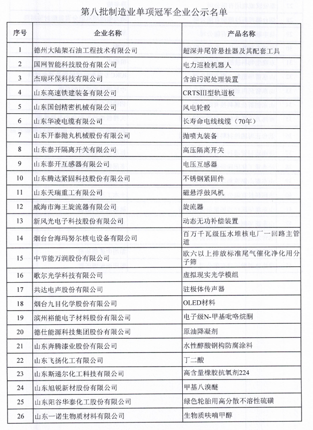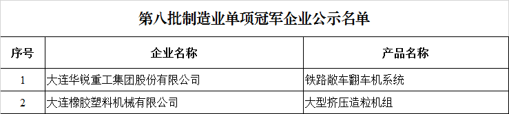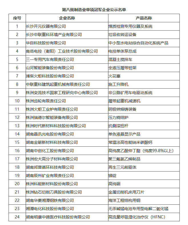 第八批制造業單項冠軍企業公示名單