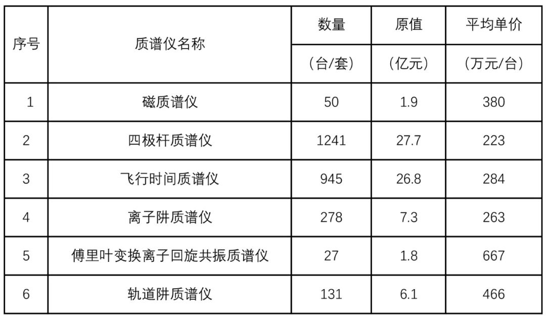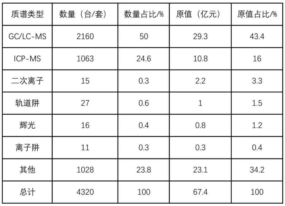 科學儀器行業本身是經濟發展的重要組成部分,發達國家儀器行業產值通常占GDP5%左右[20]2021年國內質譜儀市場大約150億元,約占全球市場的30%[21]。當前,我國進口的質譜儀器主要類型為廣泛應用于生物學研究中的氣相/液相色譜質譜聯用儀器(GC/LC-MS),據國家網絡平臺海關監管數據,2021年海關進口大型質譜儀器約半數為氣相/液相質譜聯用儀,其次為電感耦合等離子體質譜儀器,數量占比24.6%;進口的二次離子質譜儀器數量僅有15臺(套),但原值達到2.2億元(表6)。