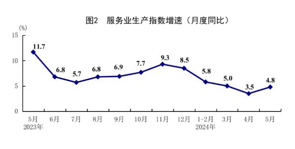5月份,全國服務業生產指數同比增長4.8%,比上月加快1.3個百分點。分行業看,信息傳輸、軟件和信息技術服務業,租賃和商務服務業,交通運輸、倉儲和郵政業,批發和零售業生產指數同比分別增長12.9%8.8%5.6%5.0%,分別比上月加快2.12.71.31.5個百分點。1-5月份,全國服務業生產指數同比增長5.0%1-4月份,規模以上服務業企業營業收入同比增長8.2%5月份,服務業商務活動指數為50.5%;服務業業務活動預期指數為57.0%。其中,郵政、電信廣播電視及衛星傳輸服務、互聯網軟件及信息技術服務、文化體育娛樂等行業商務活動指數位于55.0%以上較高景氣區間。