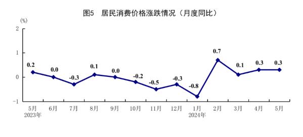5月份,全國居民消費價格(CPI)同比上漲0.3%,漲幅與上月持平;環比下降0.1%。分類別看,食品煙酒價格同比下降1.0%,衣著價格上漲1.6%,居住價格上漲0.2%,生活用品及服務價格上漲0.8%,交通通信價格下降0.2%,教育文化娛樂價格上漲1.7%,醫療保健價格上漲1.5%,其他用品及服務價格上漲3.6%。在食品煙酒價格中,鮮果價格下降6.7%,糧食價格上漲0.5%,鮮菜價格上漲2.3%,豬肉價格上漲4.6%。扣除食品和能源價格后的核心CPI同比上漲0.6%1-5月份,全國居民消費價格同比上漲0.1%