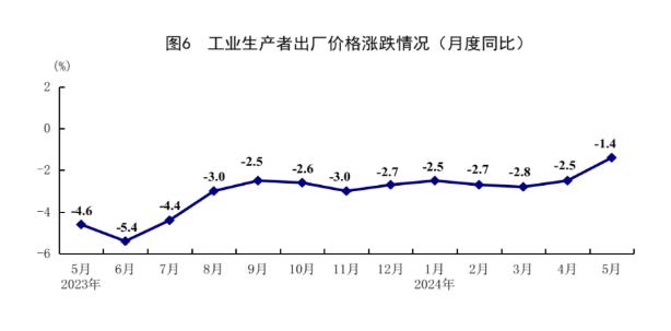 5月份,全國工業生產者出廠價格同比下降1.4%,降幅比上月收窄1.1個百分點;環比上漲0.2%。全國工業生產者購進價格同比下降1.7%,環比上漲0.3%1-5月份,全國工業生產者出廠價格和購進價格同比分別下降2.4%3.0%