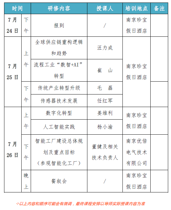 此次研修將邀請行業內的資深企業家及權威專家來講授數字化轉型、企業發展戰略、傳統產業轉型升級、傳感器技術發展、物聯網技術應用、全球供應鏈重構邏輯和趨勢、人工智能實踐等內容,以及分享資深企業家的寶貴經驗和先進理念等。