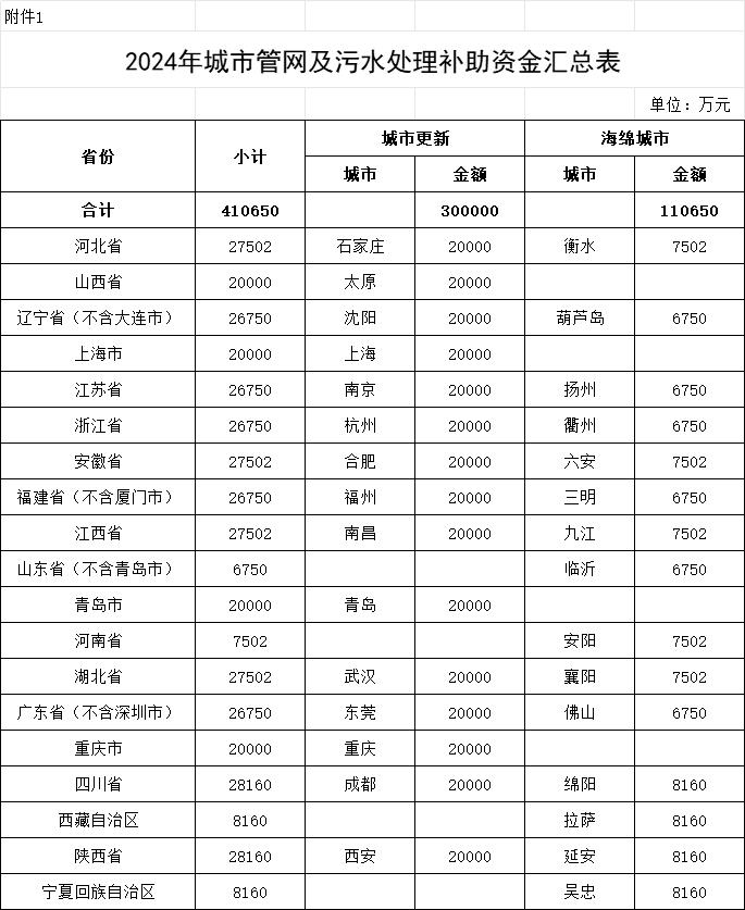 一、下達你?。▍^、市)2024年城市管網及污水處理補助資金預算指標(項目編碼10000013Z135060079040),用于支持系統化全域推進海綿城市建設示范、實施城市更新行動。具體預算金額見附件。支出列2024年政府收支分類科目“211.節能環保支出”。
