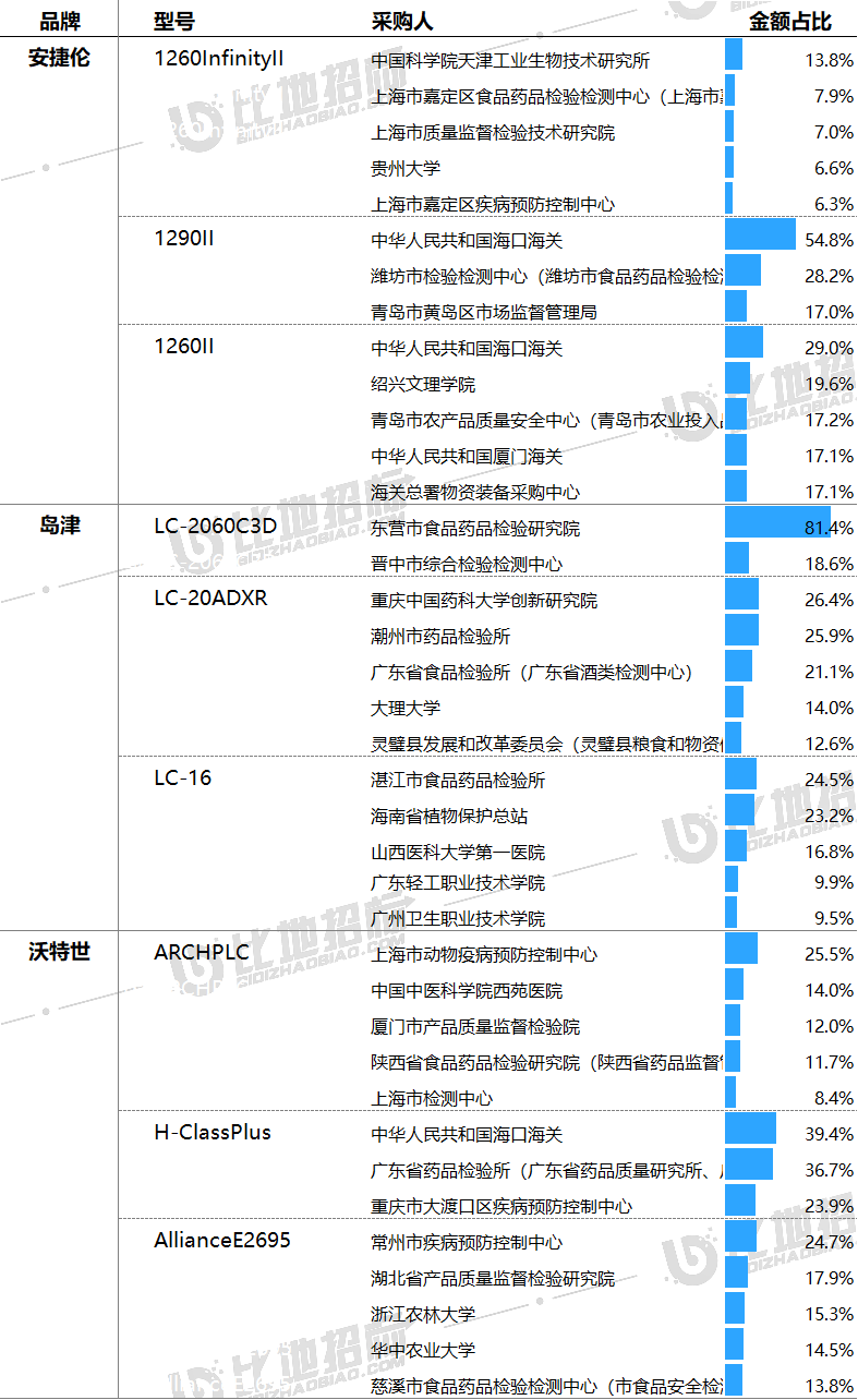 主要采購單位及對應中標品牌包括:中國科學院天津工業生物技術研究所(安捷倫),上海市動物疫病預防控制中心(沃特世),東營市食品藥品檢驗研究院(島津)等。