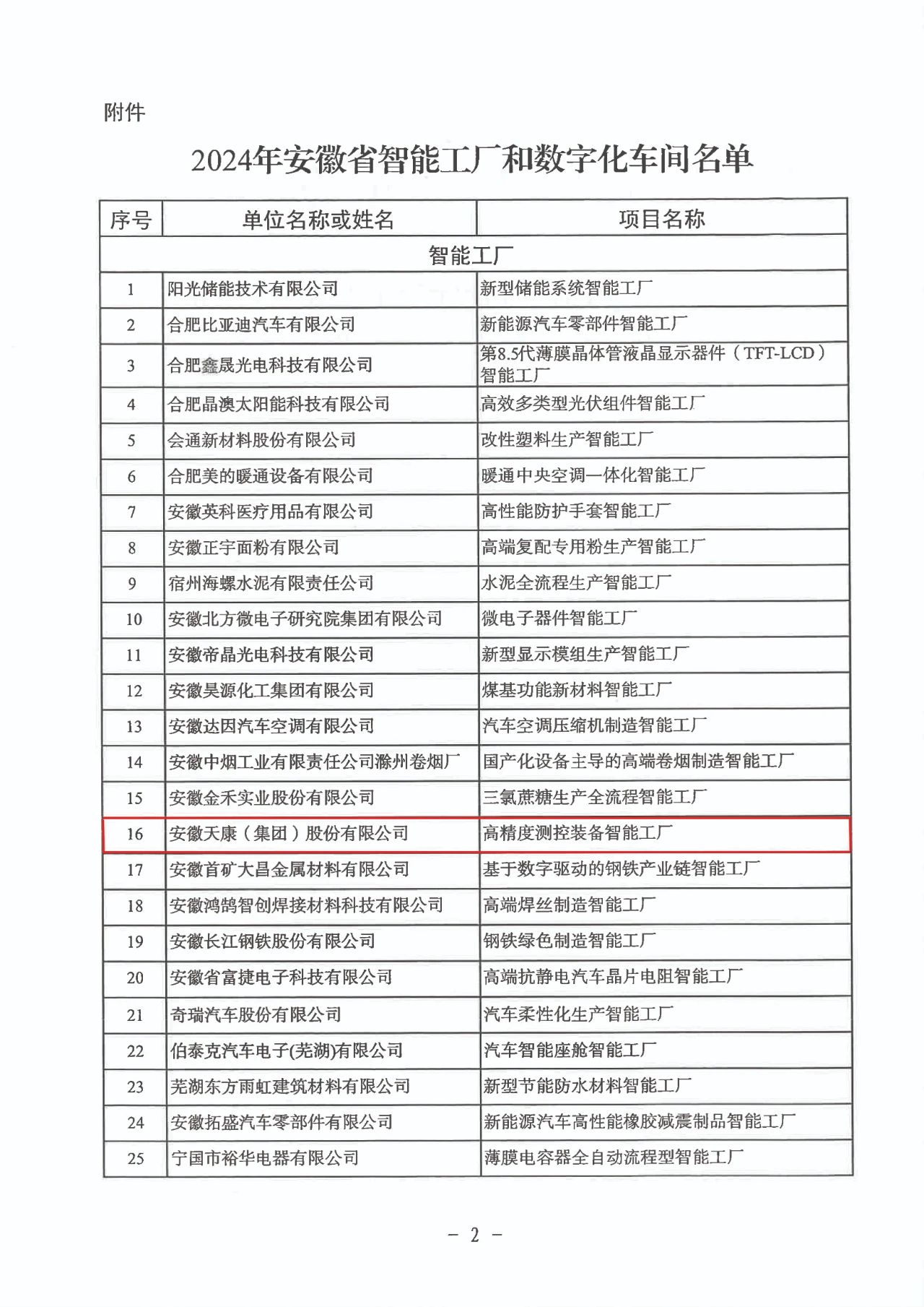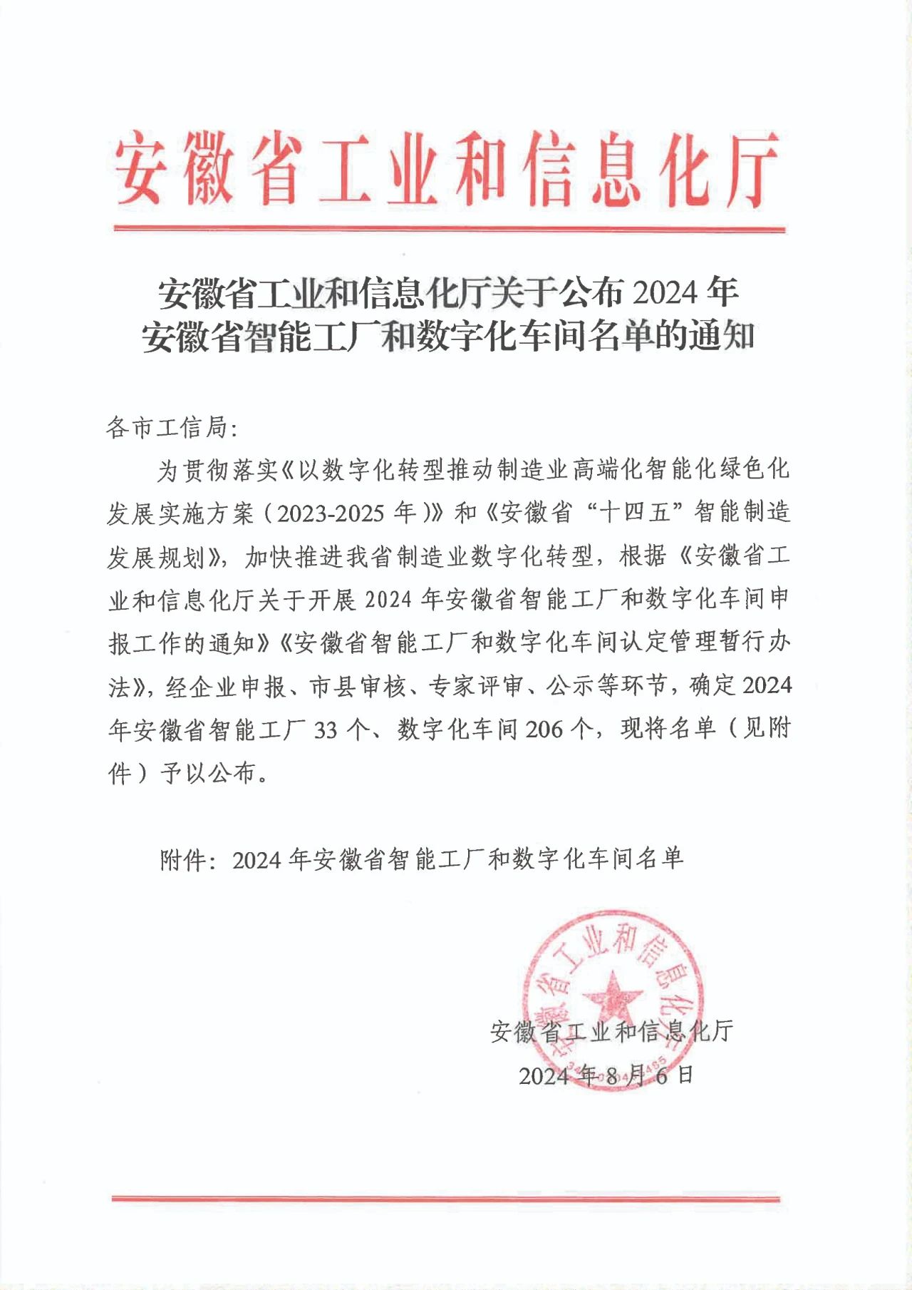 近日,安徽省工業(yè)和信息化廳發(fā)布了《安徽省工業(yè)和信息化廳關(guān)于公布2024年安徽省智能工廠和數(shù)字化車間名單的通知》。安徽天康集團(tuán)榜上有名,被評(píng)定為安徽省智能工廠。