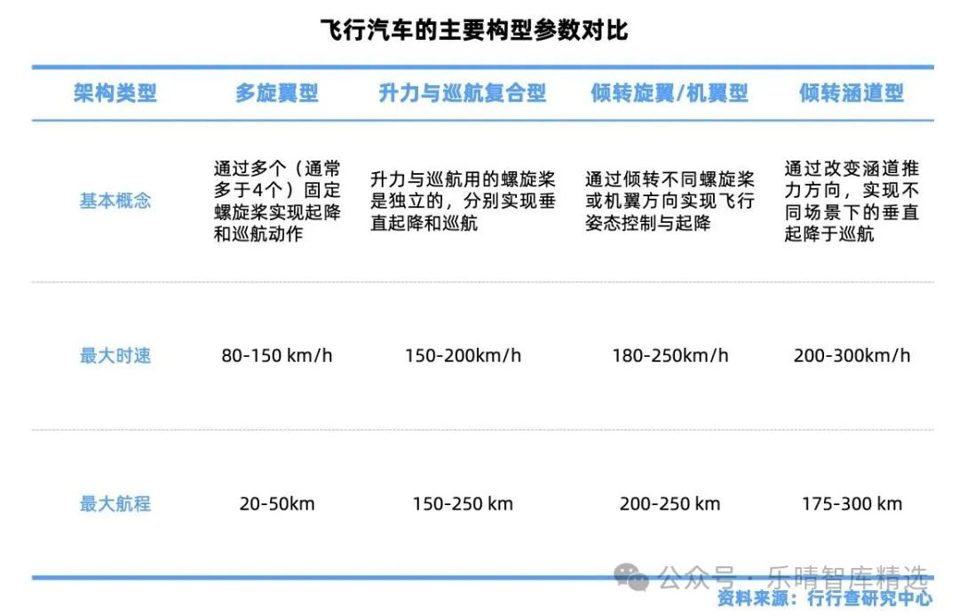 飛行汽車(chē)主要架構(gòu)包括多旋翼型、升力與巡航復(fù)合型、傾轉(zhuǎn)旋翼/機(jī)翼型、傾轉(zhuǎn)涵道型。