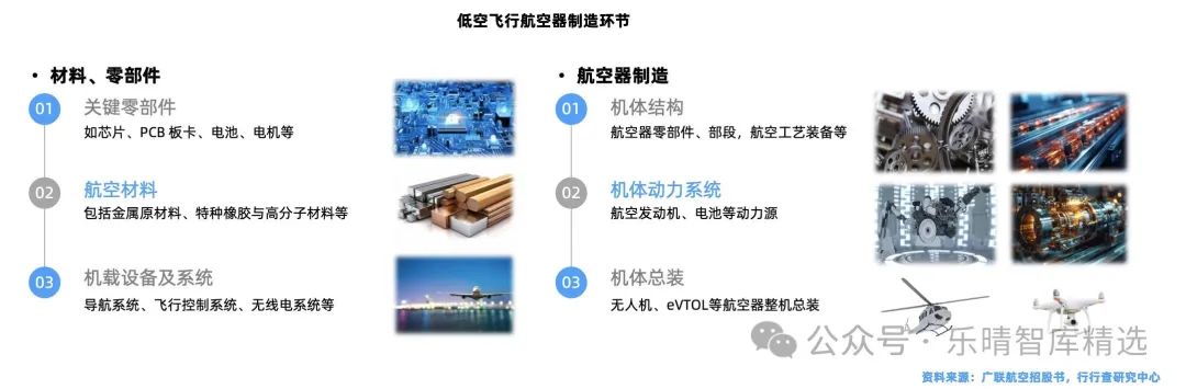低空飛行航空器制造環(huán)節(jié)包括材料及零部件和航空器制造兩大關(guān)鍵部分。