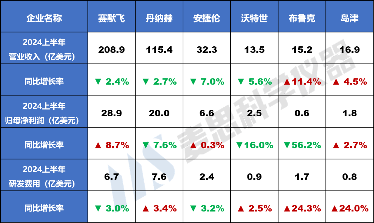 截至20248月,賽默飛、丹納赫、安捷倫、沃特世、布魯克和島津已發(fā)布2024上半年財(cái)務(wù)數(shù)據(jù)。重點(diǎn)財(cái)務(wù)數(shù)據(jù)如下: