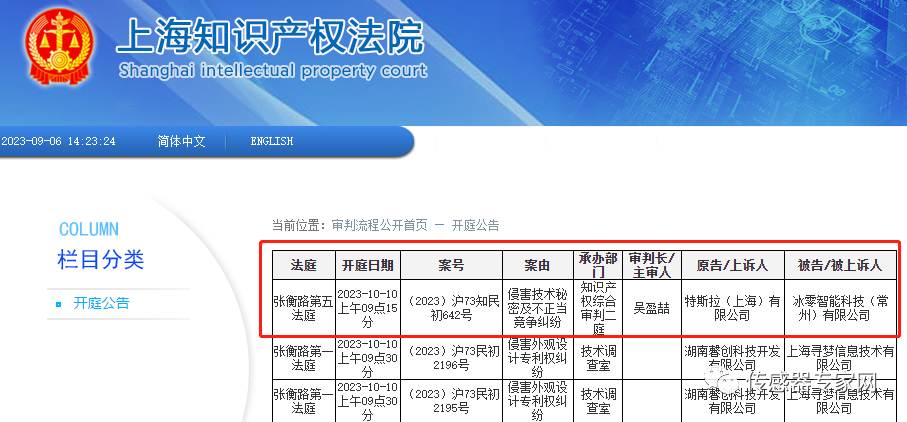 20239月,上海知識產權法院公布特斯拉(上海)有限公司起訴冰零智能科技(常州)有限公司(下文簡稱冰零科技),案由是侵害技術秘密及不正當競爭糾紛