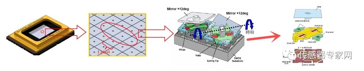 DLP芯片即在一塊硅基中,使用MEMS技術,批量制造成千上萬個鏡子”——微鏡,下圖是DMA芯片的封裝結構示意圖,可以點擊放大查看。