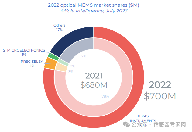 目前,DLP芯片技術大都為為德州儀器獨家專利,據Yole的數據顯示,憑借DLP芯片的營收,德州儀器占據全球光學MEMS市場近80%份額。