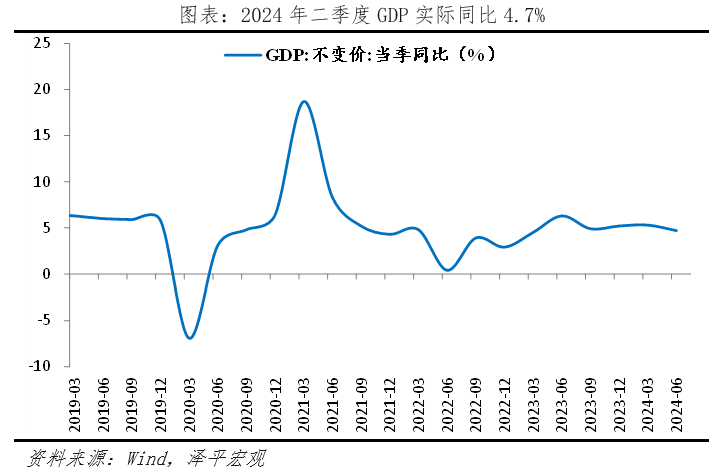 經濟總體上生產強于消費,供過于求導致物價低迷,名義GDP增速弱于實際。二季度經濟放緩,GDP環比弱于一季度,二三產業增速下滑。二季度GDP實際同比4.7%,較一季度下滑0.6個百分點。2024年上半年名義GDP增速為4.0%,實際為5.0%GDP平減指數同比初步核算為-0.9%;第二產業累計同比為5.8%,第三產業為4.6%